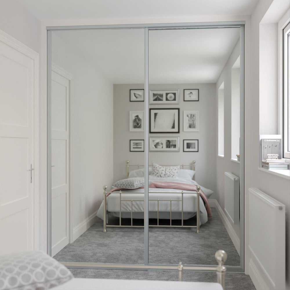 Transform your bedroom with our beautifully crafted Satin Silver Frame Curve 2 Door Mirror Sliding Wardrobe Kit. Featuring a sleek satin silver aluminium frame and full-length safety backed mirror panels, this kit is the perfect way to bring style, light, and a sense of space into any room.