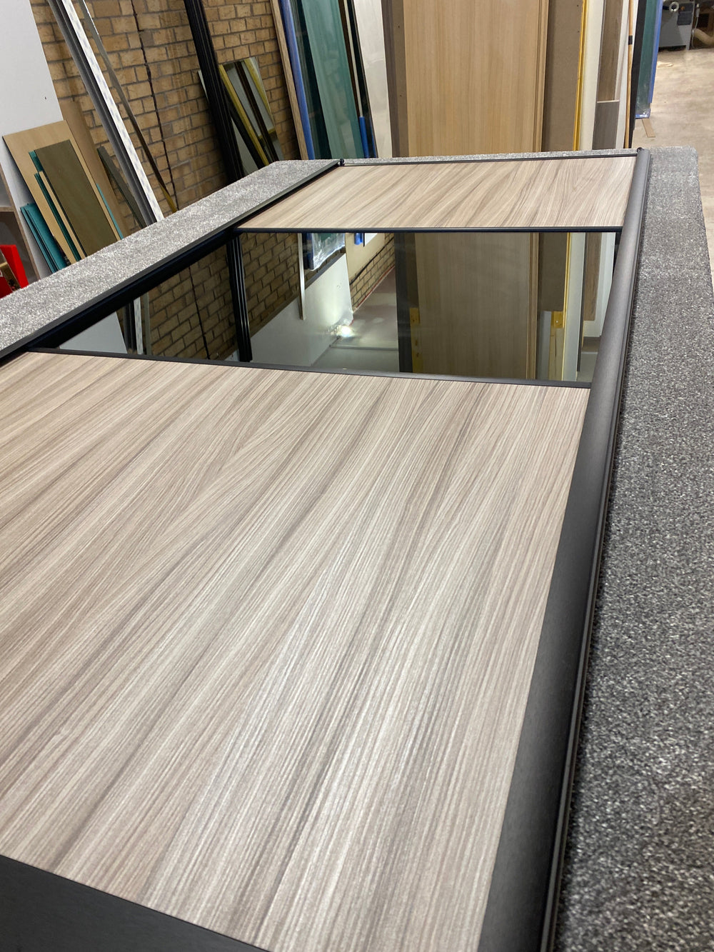 Un diseño funcional de 3 paneles hecho a medida según sus especificaciones. Un hermoso marco negro cepillado, con espejo gris con respaldo de seguridad y paneles Shorewood. es la combinación perfecta entre practicidad y estilo.