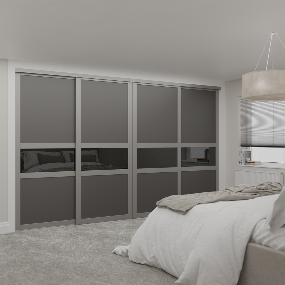 Portes de garde-robe coulissantes Shaker à cadre en graphite avec panneaux de miroir gris fumé. Ce kit à 4 portes est conçu pour répondre à vos spécifications individuelles, il s'agit d'une armoire conçue pour offrir à la fois élégance et fonctionnalité, le tout vous étant livré avec un minimum d'exigences de configuration.